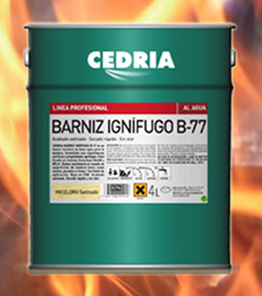 El Barniz Ignífugo B77 incoloro en base agua, está dentro de la línea Profesional de CEDRIA, es una selección de productos de última generación pensados para la industria y son desarrollados, fabricados y comercializados bajo los más rigurosos estándares de calidad. Este tratamiento ignífugo al agua es para barnizar toda clase de maderas en interiores.