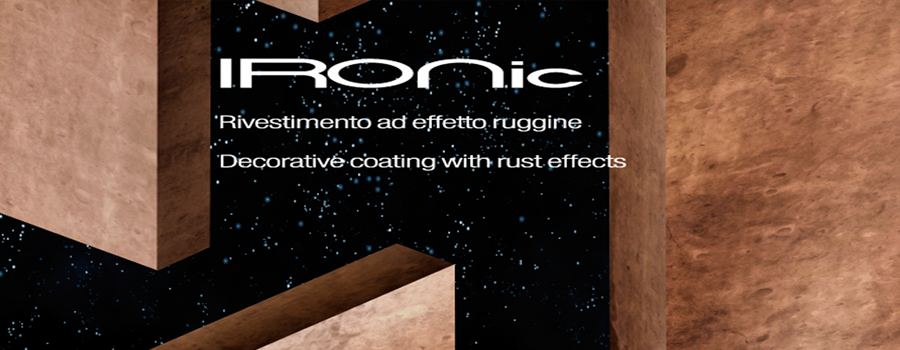 Ironic… Efecto óxido con estilo urbano, es un revestimiento decorativo para interiores y exteriores que consta de una pasta de fondo a base de partículas de hierro (Ironic Fondo) y un activador corrosivo (Ironic activador), para oxidar superficies o fondos metálicos de manera decorativa y controlada.