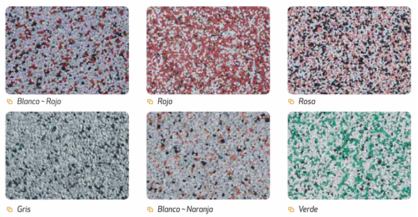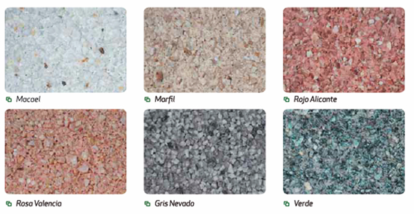 Mortero acrílico-mineral de ligante transparente y árido coloreado de canto rodado.