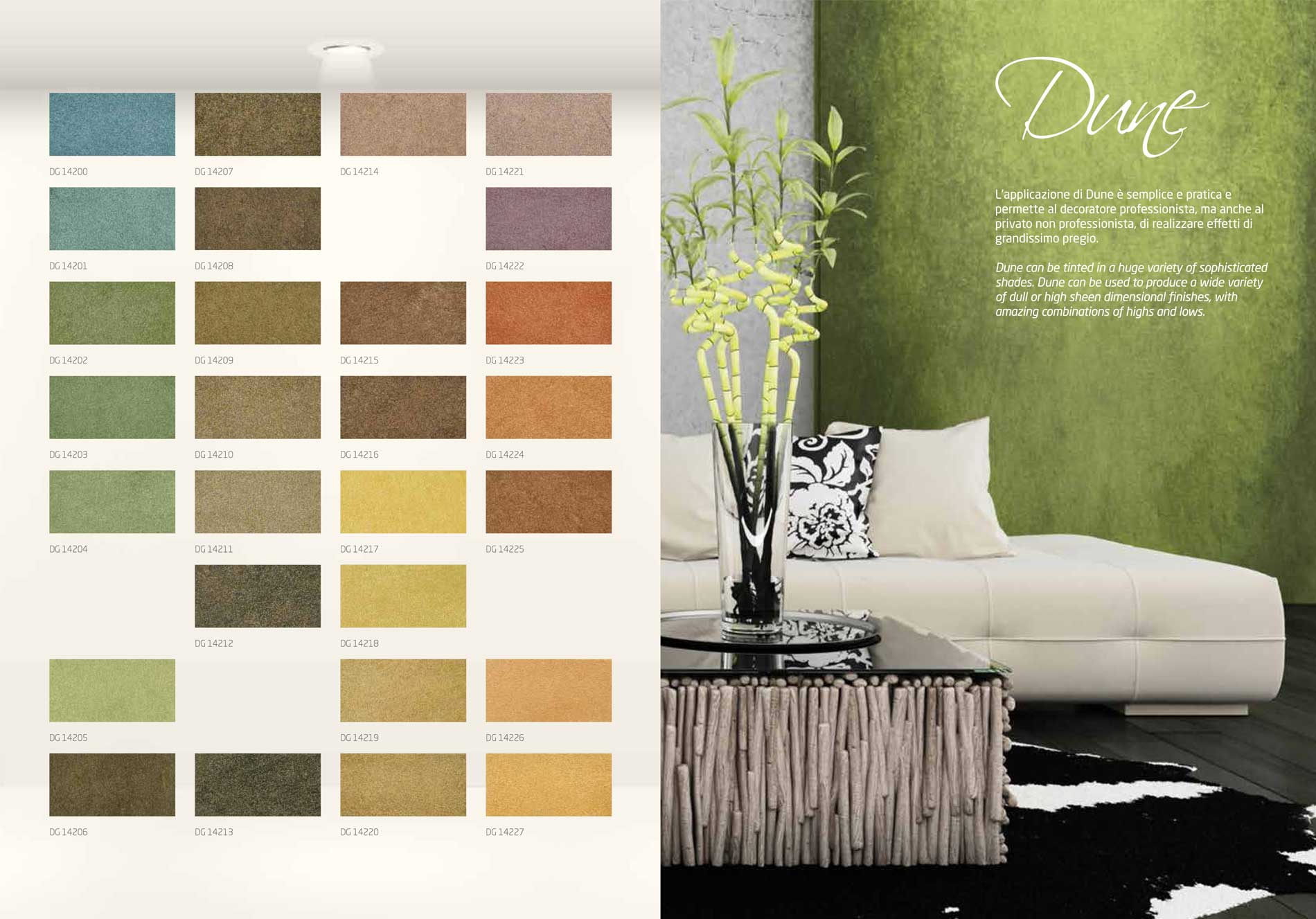 Dune amb efecte metàl·lic, és un acabat molt elegant i luxós, que es pot utilitzar per reproduir una gamma gairebé infinita d'efectes tridimensionals, amb sorprenents combinacions. La textura final depèn de la mà i la creativitat de l'aplicador, que pot crear resultats únics i sorprenents.