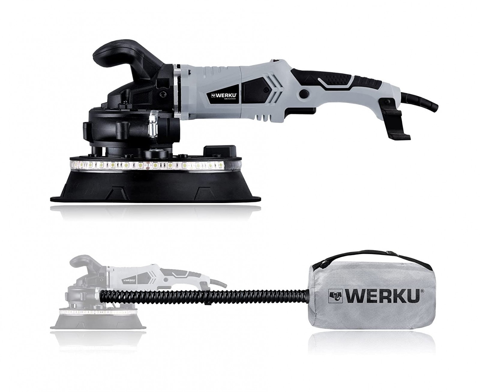 • Cos d'ABS composite, interruptor amb botó de funcionament continu, sistema d'extracció integrat compatible amb aspirador, mànec ergonòmic i antilliscant, mànec auxiliar de suport, selector de velocitats, sistema integrat de llum LED de visió de 360 graus i fixació del disc amb velcro.
